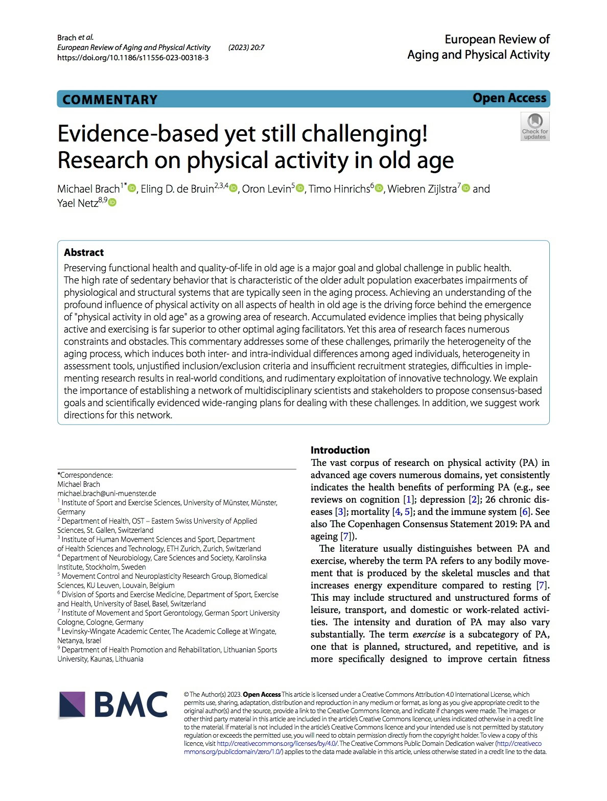 Brach, M., de Bruin, E.D., Levin, O. et al. Evidence-based yet still challenging! Research on physical activity in old age. Eur Rev Aging Phys Act 20, 7 (2023)
