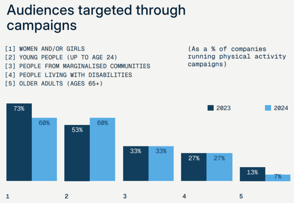 80% of the WFSGI members ran campaigns aimed at audiences at risk of inactivity – recognising the mental and emotional barriers to activity and presenting activity as a cathartic experience accessible to everyone, no matter your fitness level. The report includes studies from New Balance, PUMA, ASICS, and Decathlon.