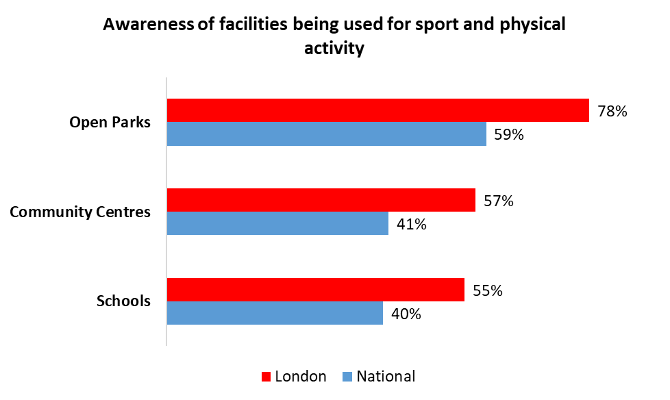 More than three quarters of London respondents (78%) say that people take part in sport or physical activity in open parks. Community centres (57%) and schools (55%) follow closely behind.