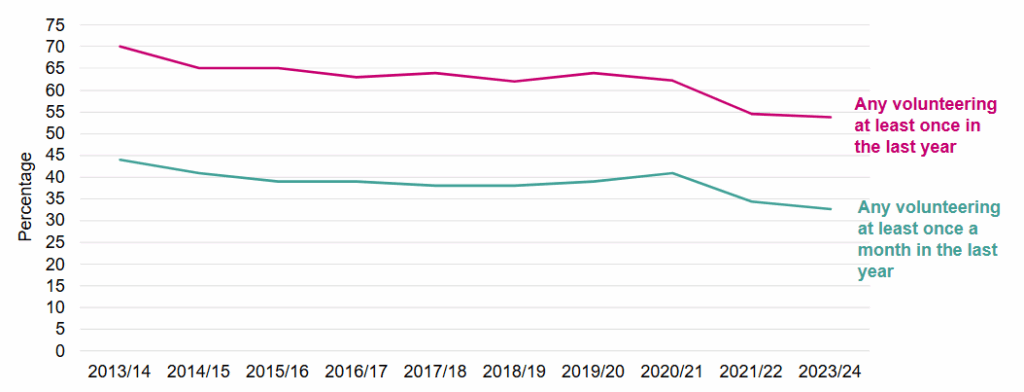 - Volunteering has been in decline over the last 10 years, and has not recovered to pre-Covid levels